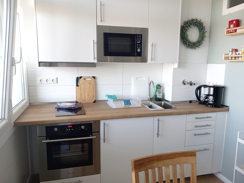 Die Einbauküche ist vollständig eingerichtet und ermöglicht es Ihnen, Ihre Mahlzeiten bequem selbst zuzubereiten. Für zusätzlichen Komfort sorgen eine Geschirrspülmaschine, Waschmaschine und Trockner, die insbesondere bei längeren Aufenthalten von Vorteil sind.