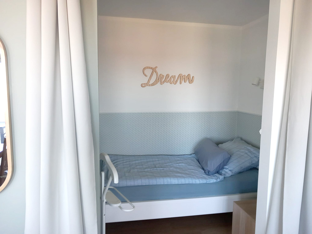 Der kombinierte Wohn- und Schlafbereich ist mit zwei komfortablen Einzelbetten ausgestattet und lädt nach einem ereignisreichen Tag zum Entspannen ein. Ein Smart-TV mit Satelliten-/Kabelanschluss sowie schnelles WLAN stehen für Ihre Unterhaltung und Kommunikation zur Verfügung.